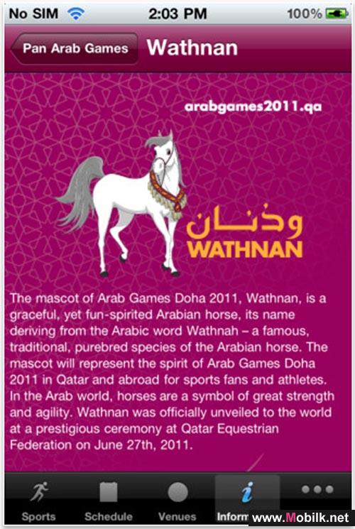 وقد تم تطوير التطبيق الجديد حتى يتمكن محبو دورة الألعاب العربية من متابعة آخر أخبار هذه البطولة وما تقدمه من أنشطة رياضية مختلفة، وذلك أينما كانوا. وقد عمل هذا التطبيق المجاني، والذي تم تنزيله في كل من الولايات المتحدة الأمريكية وألمانيا وبريطانيا وفرنسا والشرق الأوسط، على إبقاء المشجعين على تواصل مع الحدث الرياضي الضخم الذي استضافته قطر.