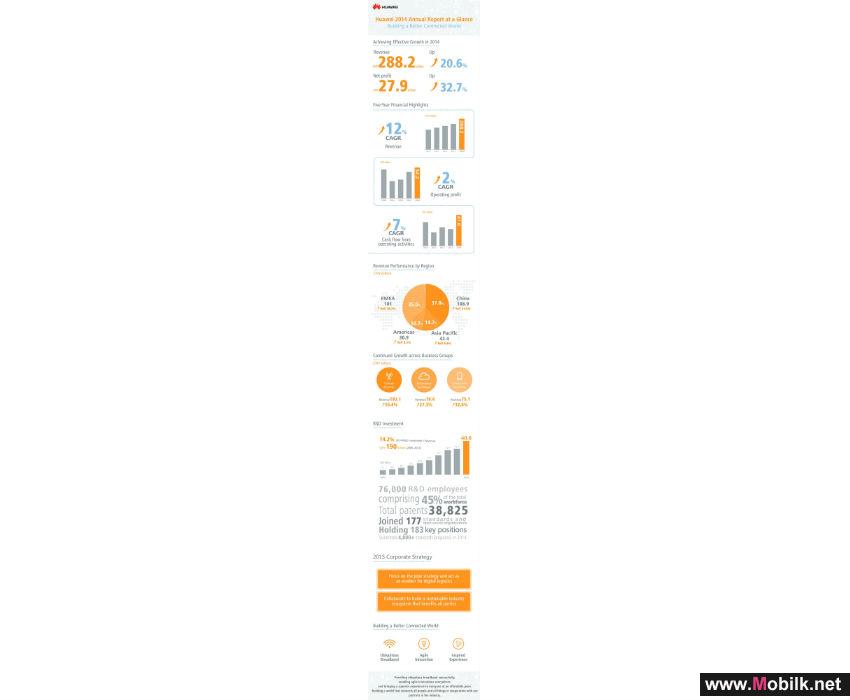 موبايلك - نشرت "هواوي"، الشركة الرائدة عالمياً في توفير حلول تقنية المعلومات والاتصالات، التقرير السنوي المدقق لنتائجها المالية لعام 2014، والذي كشف عن نتائج غير مسبوقة في الإيرادات وصافي الأرباح، وأداء مالي عالمي قوي في مختلف أعمال الشركة. وبلغت إيرادات "هواوي" 288.2 مليار يوان صيني (46.5 مليار دولار أمريكي) أي ما يمثل زيادة بنسبة 20.6% مقارنة مع العام الماضي، في حين وصل الربح الصافي إلى 27.9 مليار يوان صيني (4.5 مليار دولار أمريكي) مسجلاً زيادة سنوية بنسبة 32.7%، علماً بأن شركة "كيه بي إم جي" (KPMG) العالمية كانت الجهة المسؤولة عن عملية تدقيق التقرير السنوي.