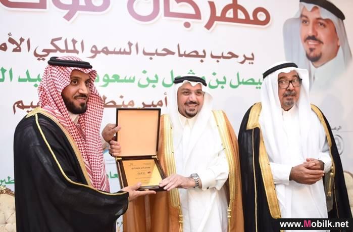 كرم صاحب السمو الملكي الدكتور فيصل بن مشعل بن سعود بن عبدالعزيز امير منطقة القصيم الاتصالات السعودية STC لرعايتها الماسية لمهرجان قوت للتمور بالبطين, وذلك في الحفل