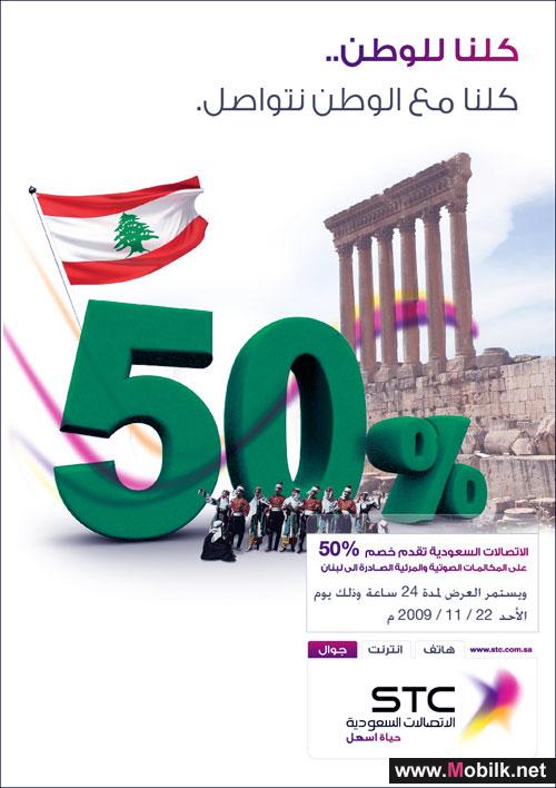 أعلنت شركة الاتصالات السعودية عن تقديمها تخفيضاً بنسبة 50% لعملاء الجوال بمناسبة اليوم الوطني لدولة لبنان، ويشمل التخفيض أجور المكالمات الصوتية والمرئية والرسائل